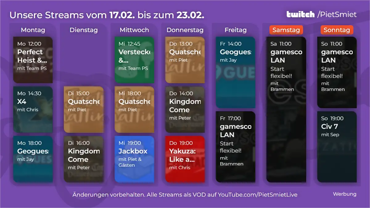Der nächste Stream ist Montag um 14:30 Uhr auf Twitch Streamkalender (klickcklick)